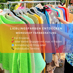 Sie möchten eine Farbberatung im Kreis von gleichgesinnten Frauen erleben? Dann buchen Sie sich einen Platz in diesem Workshop, sowohl als Einzelperson oder mit Freundinnen zusammen. Die Termine sind festgelegt und die Teilnehmerinnenzahl ist auf 4 Frauen begrenzt. Den Buchungsbutton zum Shop-Warenkorb und alle Details finden Sie auf der Seite.